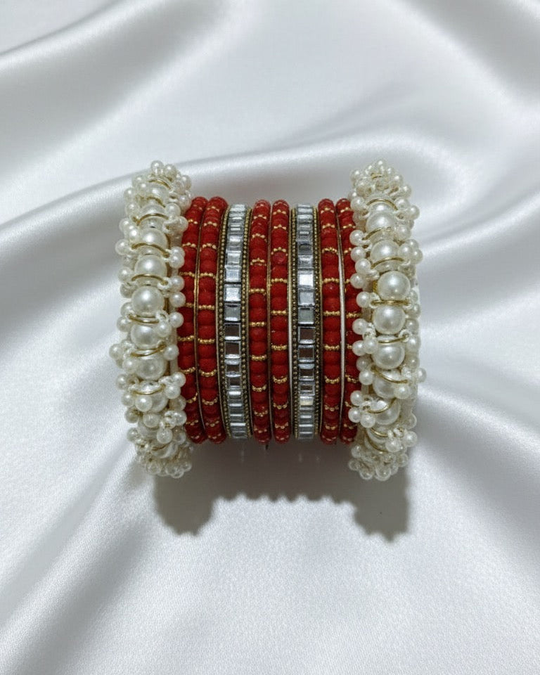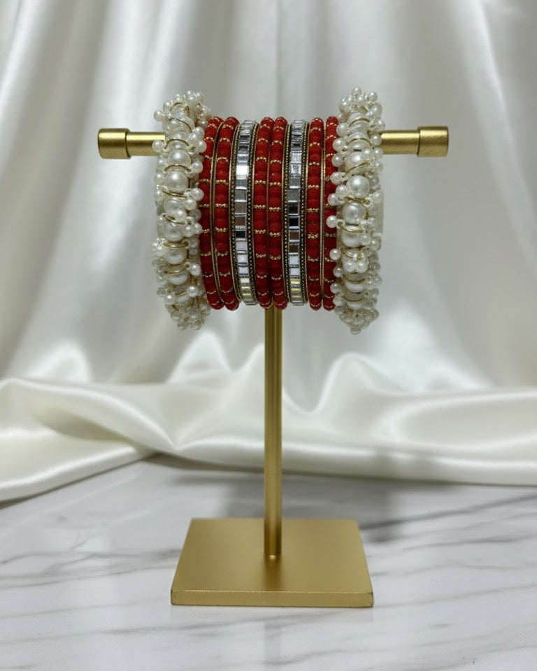 Green and gold blend gracefully to create a look of sophistication and royalty. Each bangle in this set is crafted with precision and attention to detail, featuring finely embedded stones that shimmer beautifully under natural light. The premium polish ensures lasting shine, while the smooth inner finish offers comfort even during extended wear.