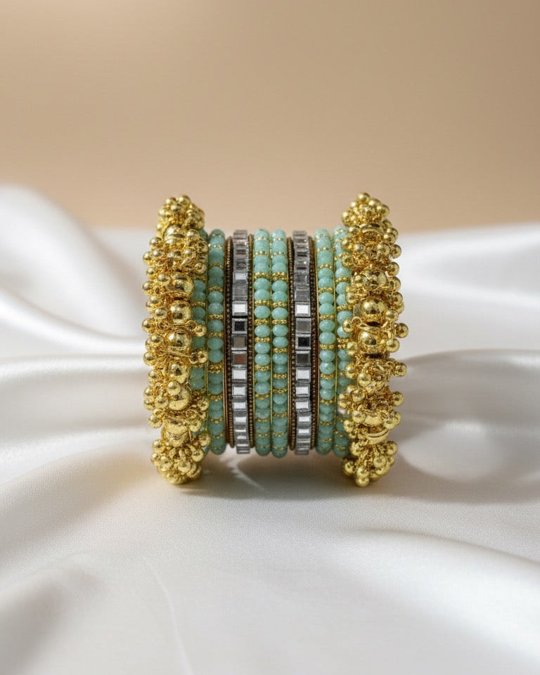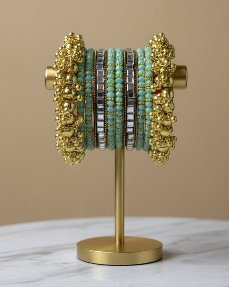 A bright gold-toned bangle set that radiates festive brilliance and effortless charm. Each piece is finely crafted with intricate detailing and a smooth, polished surface that enhances its radiant glow. The durable metal base ensures long-lasting shine, while its balanced design makes it perfect for pairing with both traditional and modern outfits.
